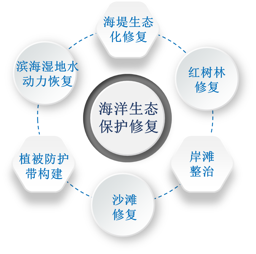 项目针对西湾、江山半岛和企沙半岛等区域海堤结构安全性不足,海岸带水动力环境弱、水质交换能力不足,海岸持续侵蚀、近岸沙滩受损严重,海洋生态系统逐步退化等问题,遵循“基于自然的海洋生态保护修复”和“全域生态与减灾协同增效”的设计原则,通过实施海堤结构生态化改造、海湾水动力环境提升、海岸侵蚀防护及沙滩修复、植被防护带构建等工程措施,构筑多层次生态减灾空间体系,构建稳定、健康的海岸带生态环境,维护生态安全。