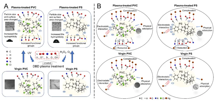 ; G' \$ e( |9 R0 F: D0 G- |  图1 等离子体处理微塑料的机理示意图(A)以及原始微塑料和等离子体处理后的微塑料吸附汞的推测机理图(B)' M# Q+ J4 D% N$ o' u9 ]