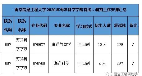 ( a0 @1 l) l! z$ Q! l0 h& {: H 南京信息工程大学海洋科学学院包含两个专业:海洋气象学、海洋科学,复试分数线及招生人数如下: ' |7 A* }+ a( T9 k' _