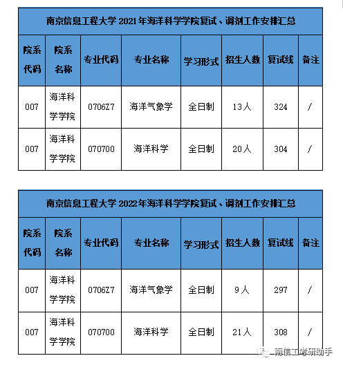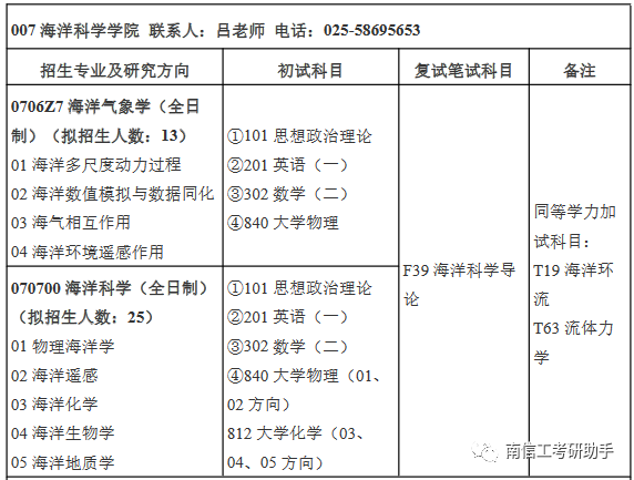 5 G; `# S2 T6 l$ q 另外,考试科目以及大纲自然也是大家比较关心的,2022年南京信息工程大学海洋科学学院各专业初试及复试科目如下: 0 u. ? u+ m$ x1 \! G! U+ I