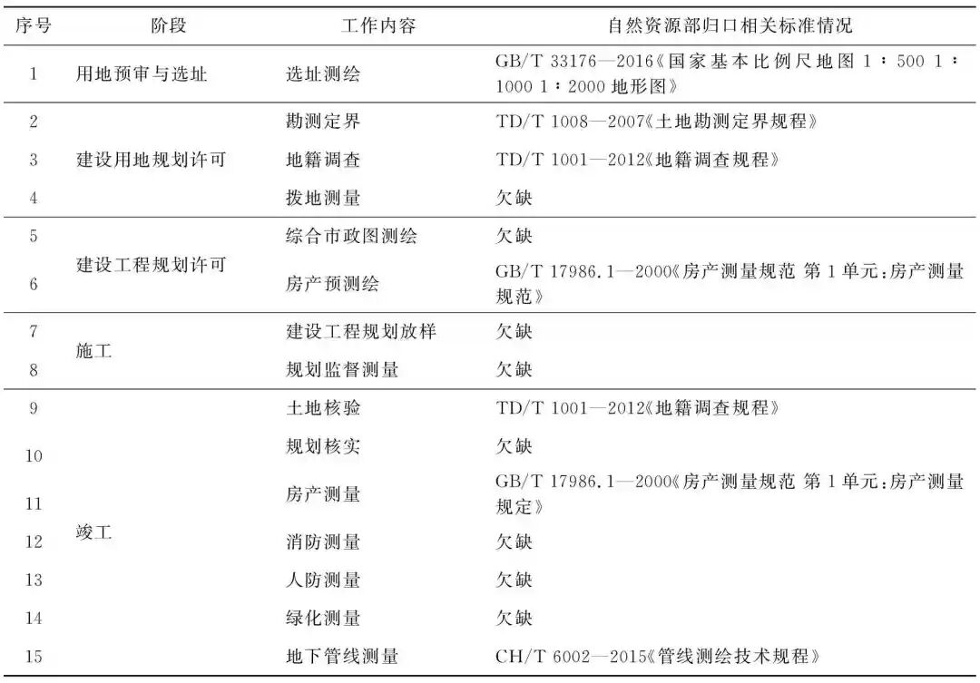 目前,“多测合一”涉及的测绘业务除消防测量内容缺少相关标准规定外,其他专业的测量都有相关标准规定(表1),但这些标准大都属于城市建设行业标准,与住房与城乡建设部归口的行业标准相比,归口自然资源部的行业标准占比较小,大部分测绘业务均可用住房与城乡建设部归口的《城市测量规范》解决。如果“多测合一”工作中每个专业测绘编制一个标准,自然资源部的标准缺口有些大(缺8部标准,见表2)。同时存在有些专业测绘标准自然资源部未必能够主导的问题。借力“多测合一”开展优化营商环境,对《工程建设项目“多测合一”技术规程》进行编制,顺势彻底解决了这一问题,各种专业测绘工作都有技术标准可参考了。 $ a5 \2 d" j' ^0 M3 u* u' A) t