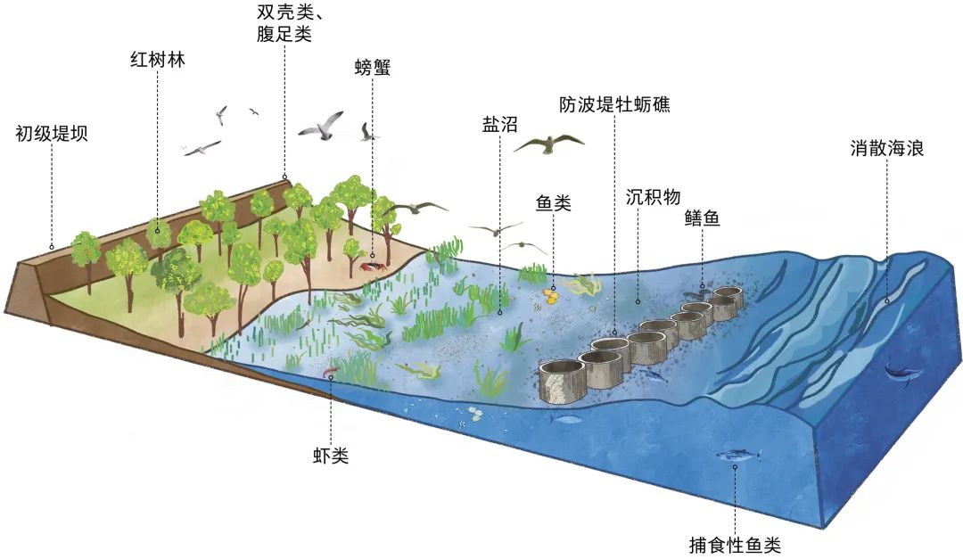 有哪些值得我们关注的典型呢? 01红树林生态系统红树林是热带、亚热带海岸带海陆交错区生产能力最高的海洋生态系统之一,在净化海水、防风消浪、维持生物多样性、固碳储碳等方面发挥着极为重要的作用。 2 x D& j5 O) E5 b' r( _) \