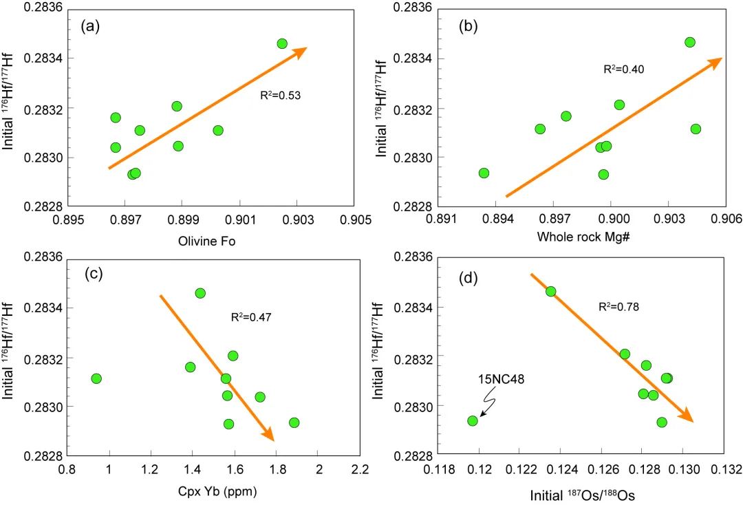 8 j2 x( ]* e4 p8 }7 a 和方辉橄榄岩相比,二辉橄榄岩则具有与饱满的深海橄榄岩类似的成分特征,其经历了低程度的部分熔融与交代过程。二辉橄榄岩的初始176Hf/177Hf比值与代表其熔融程度的指标(如橄榄石Fo值、全岩Mg#值、单斜辉石Yb含量等)以及初始全岩187Os/188Os比值均表现出了较好的相关性(图2)。部分二辉橄榄岩样品具有相对古老的Hf-Os同位素成分特征,这表明古老的地幔域不均匀的分布在软流圈地幔中,俯冲起始过程中软流圈地幔的上涌可能导致这些含有古老熔融信息的地幔增生到弧前地区(图3)。