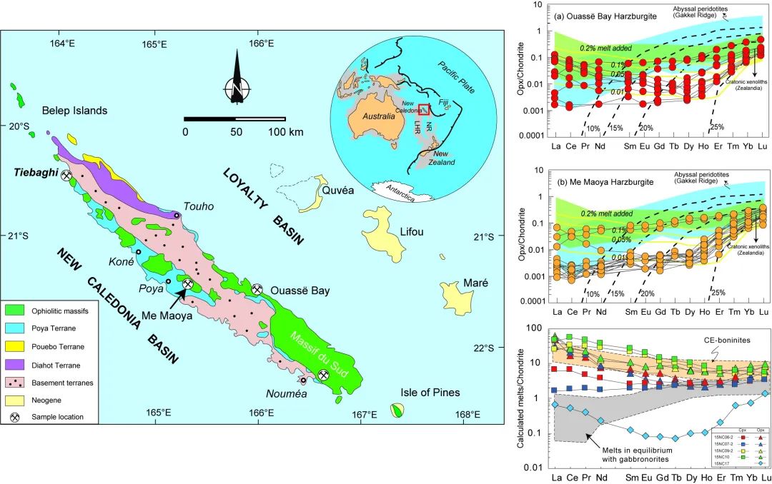 针对上述科学问题,海洋试点国家实验室深海研究中心、海洋地质过程与环境功能实验室的许阳博士、石学法研究员与中国科学院地质与地球物理研究所刘传周研究员等合作,对位于西南太平洋的新喀里多尼亚蛇绿岩的地幔岩石进行了系统的矿物学、岩石学和地球化学成分研究(图1)。新喀里多尼亚蛇绿岩被认为是全球范围内最典型的弧前蛇绿岩之一,其代表通过构造活动就位于陆地上的古大洋岩石圈残片。研究人员对缺乏原生单鞋辉石的方辉橄榄岩样品的斜方辉石矿物进行了原位的主、微量成分分析以及成分模拟计算,并测试了纯橄岩和辉石岩岩脉的主量元素、微量元素和Sr-Nd-Hf-Os同位素成分。研究结果表明新喀里多尼亚方辉橄榄岩经历了约25%的高程度部分熔融过程,并且与不同类型的交代介质发生了多阶段的熔岩反应过程。
