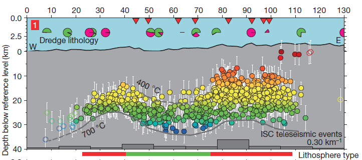 7 D7 l% g& f* [ OBS和陆地上的地震台站还还能有效记录洋中脊处发生的天然地震,通过对不同的地震台站所接受到的地震初波进行处理分析,即可求出其震源机制解。震源机制解不仅可以识别断层性质,还可以揭示洋中脊区域的应力状态(Bohnenstiehl and Dziak, 2009)。由于大洋岩石圈主要的流变行为表现为弹性,软流圈以塑性为主,因此地震波作为弹性波只能在岩石圈中传播。通过收集大量的洋中脊小震震中深度数据,可以有效地刻画其岩石圈深度结构(Schlindwein and Schmid, 2016)。