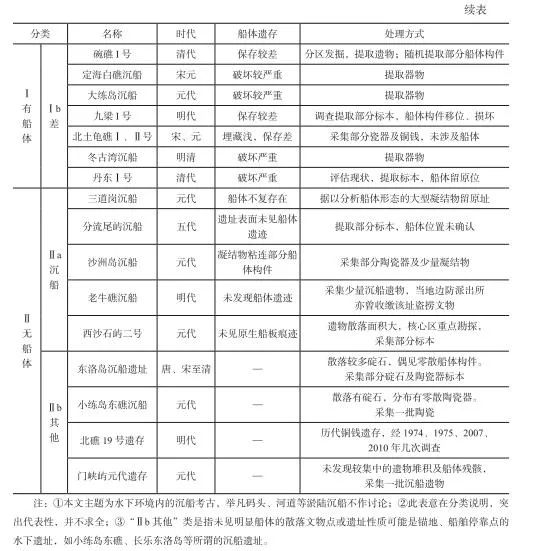 水下考古学(Underwater Archaeology)与海洋考古学(Maritime Archaeology)是与沉船考古相关的两个概念。前者从“水下”与“陆上”两种遗存保存环境、后者从“海洋性”与“陆地性”两类遗存性质出发,在若干案例研究的基础上,逐渐形成了有关理论、方法及相关技术。无论从哪种情况看,沉船作为古代航行风险与海事事件的直接体现都是其中特征鲜明的重要组成部分。因此,也有研究者直接将调查、发掘、研究各类船舶实物、造船技术、船舶社会、交通贸易诸内容的学科领域称为“船舶考古”(Boat Archaeology)或“沉船考古”(Shipwreck Archaeology)。本文即取此义,并以保存于水下环境的沉船遗址为主要论述对象。总体来说,单个沉船事故的偶然性与沉船群体分布的可能性相结合,沉船事件的时间单一性与沉船区域的历时性相结合,船载文物的体大量巨与有机脆弱相结合,沉船遗存的考古学普遍性与特殊性相结合是沉船考古的主要特点。这些特点在很大程度上规定或限制了沉船考古的理念、方法与技术。本文拟以沉船考古调查、发掘、保护等环节为主要内容,通过对已有水下考古实践的归纳、比较,对沉船考古的相关问题予以初步分析、总结。一、沉船资源调查考古调查是考古工作的起始步骤,可分二义:一是研究对象缘此出现,调查以发现具体对象为目的;二是超越具体发现,意在以某种理论、理念为指导,通过若干方法设计,使调查成为考古学的系统研究方法。两者并行不悖、相辅而行。随着考古学理论方法和调查技术的进步,前者成为后者的目标之一,而后者在既定条件和方法前提下的“无发现”也会成为调查成果。多年来,水下考古工作者通过陆地调查收集比选水下遗存线索,通过海洋物探设备(如多波束声呐、旁侧声呐、浅地层剖面仪、磁力仪等)对线索进行定位勘察,进而潜水评估其有无、年代、范围、性质诸问题,并采取进一步措施。直到现在,在抢救性文物保护的背景下,这种方式还在水下考古(尤其是沉船考古)的工作中发挥作用。然而,以渔业生产、盗掘盗捞信息为线索的作业方式毕竟被动无序,而较为显著的沉船线索也日渐枯竭(图一)。从逻辑上看,过度单纯的“线索”导向不便于研究工作在调查阶段的提前介入,水下遗存的预防性保护也无从谈起。从水下考古学科建设与资源管理的角度出发,如何提高沉船调查的主动性、系统性,如何使早期调查、考古发掘与文物保护间的联系更为紧密合理亟须引起进一步的重视。下面列举“海坛海峡水下考古区域调查”与“台湾海峡荷兰东印度公司沉船调查”两个例子加以说明。  海坛海峡水下考古区域调查:该案例通过系统收集资料,分析海坛海峡地理特征、风险分布、航路交通、历史地位与既有考古发现,从而形成信息叠合度最高的“目标区域”,以此作为主动性水下考古调查工作的优先选择。在目标区域内,使用海洋物探设备开展系统性探测以取得海床异常点(anomaly)数据,在对异常点数据进行图像解译与分类分级的基础上,通过潜水作业(潜水员或水下机器人)对其记录、确认、分析、研究。既有研究证明海坛海峡沉船发现、航海风险、航路分布、海域历史地位等要素高度契合,充分显示了对沉船事件进行历史研究、区域分析的可能性。反之,以区域为着眼点的调查方法也是提高水下考古调查主动性、系统性的合理途径。我们将上述流程叫作“水下考古区域调查法”。需特别指出的是,水下考古调查不同于陆地,既易陷入“大海捞针”、无从下手的窘况,又缺乏“所见即所得”的直观效果,不能机械照搬田野考古区域系统调查(systematic regional survey)。因此,如何形成一套行之有效的水下沉船探测技术与异常点识别方法以支撑“水下考古区域调查法”实践是目前的难题,这也正是水下考古物探技术应重点关注的研究方向。目前国内学界已有的零星探讨还未达到应有的深度,还有很长的路要走。国外也已开始了类似研究。例如,韩国专门设立了水下文物探测技术课题,使用多种设备对已知水下埋藏对象进行探测,并从设备、频率、参数、扫测对象等角度详加考察,积累基础资料数据,以提升水下考古调查方法。爱尔兰则利用其北海岸的多波束测深数据开展了异常点提取、特征解析、沉船辨识等一系列研究工作,总结并形成一套工作流程,效果良好。台湾海峡荷兰东印度公司沉船调查:该案例是台湾“中央”研究院历史语言研究所澎湖海域水下考古调查的组成部分。工作目的是针对特定时期、特定海洋活动空间内的特定海洋文化模式,系统搜集沉船记录,一方面分析船难事件的空间分布,为后续沉船调查提供引导;另一方面分析船难事件的区域类型、船只种类,以方便沉船遗址确认后的深入研究。在此研究中,作者利用荷兰东印度公司的沉船档案,整理出了39笔船难记录。从沉船船只类型看,台湾海峡荷兰沉船的可能种类有归国大船(retourschip)、快船(jacht或pinas)、平底货船(fluit)、岸援船(galjoot)、船载小船(scheepsboot)、组装船(afbreekboot)等;从沉船空间分布看,以台南安南安平(9笔)密度最高、福建厦门漳州(6笔)次之;从船难肇因、船只类型、与航行季节的关系看,超过60%的船难是自然因素所致,70%船难船只类型是300吨以下中小型快船与平底货船,近80%船难发生于夏、秋、冬季,显示出船难事件与台风和东北季风等极端海况的关联