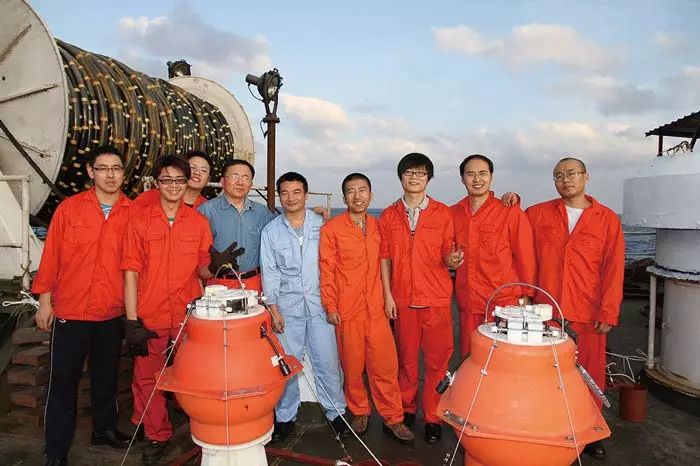 * V8 J, b9 N( b6 ?% q1 U- I$ D ▲ 2010 年南海西南次海盆3-D 调查使用的国产I-4C 型宽频带OBS 装配完成后科考队员合影 - W1 [/ ]% ^, n