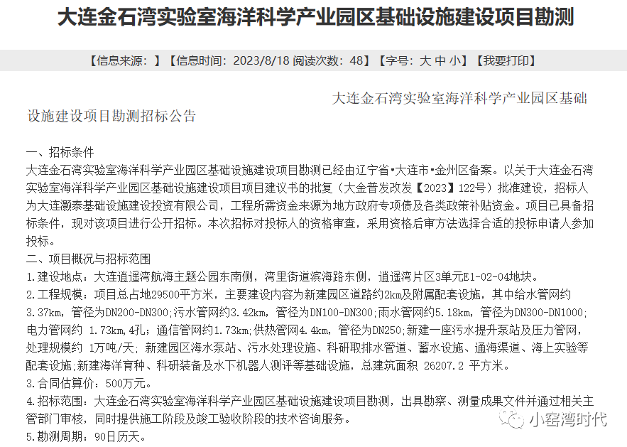 1.建设地点:大连逍遥湾航海主题公园东南侧,湾里街道滨海路东侧,逍遥湾片区3单元E1-02-04地块。2.工程规模:项目总占地29500平方米,主要建设内容为新建园区道路约2km及附属配套设施,其中给水管网约3.37km,管径为DN200-DN300;污水管网约3.42km,管径为DN100-DN300;雨水管网约5.18km,管径为DN300-DN1000;电力管网约 1.73km,4孔;通信管网约1.73km;供热管网4.4km,管径为DN250;新建一座污水提升泵站及压力管网,处理规模约 1万吨/天; 新建园区海水泵站、污水处理设施、科研取排水管道、蓄水设施、通海渠道、海上实验等配套设施;新建海洋育种、科研装备及水下机器人测评等基础设施,总建筑面积 26207.2 平方米。