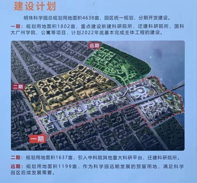 明珠科学园采用中科院与广州市共建模式,选址明珠湾区,位于珠江街东部,凤凰大道东侧,明珠湾大桥南北两侧,蕉门水道西侧,总规划用地面积4638亩,其中启动区(一期用地)1802亩,二期用地1637亩,预留发展用地1199亩。根据明珠科学园的功能定位,建设内容包括: