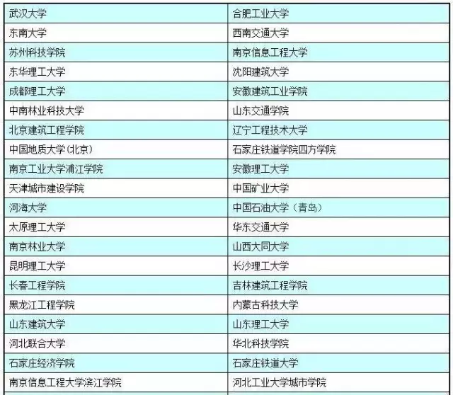 目前全国开设测绘工程专业的高等院校超过了200家,中国科学评价研究中心(RCCSE)、武汉大学中国教育质量评价中心联合中国科教评价网新近推出了《2017-2018年中国大学及学科专业评价报告》。武汉大学、同济大学、河南理工大学、辽宁工程技术大学、中南大学、中国矿业大学(徐州)等六所院校被列为测绘工程专业五星级大学;西安科技大学、西南交通大学、山东科技大学、桂林理工大学、东华理工大学、江西理工大学、长安大学、河海大学、中国地质大学(北京)、中国地质大学(武汉)、东北大学、南京师范大学、东南大学、黑龙江工程学院等14所大学被列为测绘工程专业四星级大学。需要说明的是,解放军信息工程大学等军队院校没有参加本次评选,故不在榜单内。