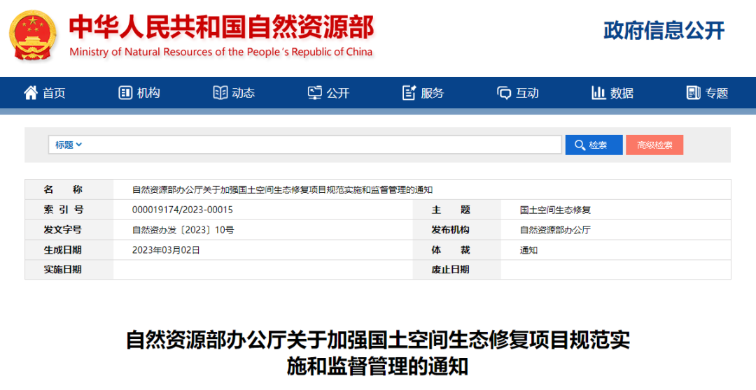 近日,自然资源部办公厅印发《关于加强国土空间生态修复项目规范实施和监督管理的通知》(自然资办发〔2023〕10号)。自然资源部国土空间生态修复司负责人进行了解读。其中提到: