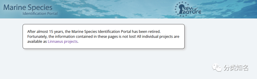 ' r8 v9 J8 U0 x e* a( d/ l2 Q! J 这个网站相信很多朋友应该进入浏览过,我以前也在公众号文章中给大家介绍过。该网站提供了很多海洋生物的鉴定知识。今天打开的时候看到它已经光荣退役了。看到它的离去,多少有些不舍。 5 U/ X8 O; n6 h