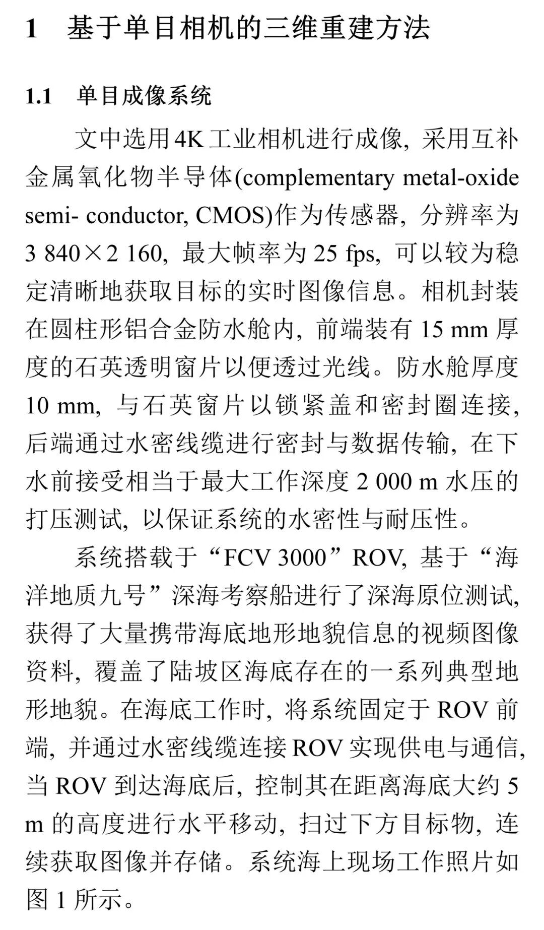 # Z) v- H+ g+ j 随着国内水下运载平台的快速发展, 基于单目相机的海底调查研究已有很多报道, 但目前多采用视频图像拼接, 即通过多幅图像获得更大范围的二维图像, 如在我国南海北部冷泉区“探索4500”AUV通过搭载光学相机拍摄了一系列海底图像, 经过处理后获得了全景高分辨率地图[16]。然而, 基于单目相机的三维重建报道较少, 文中针对单目相机获取的海底光学图像, 开展了图像增强和三维重建方法研究, 完成了深海微地形地貌和生物生态、矿物岩石等信息的三维重建, 支撑了我国水合物矿区的精细调查工作。      fill=%23FFFFFF%3E%3Crect x=249 y=126 width=1 height=1%3E%3C/rect%3E%3C/g%3E%3C/g%3E%3C/svg%3E)  fill=%23FFFFFF%3E%3Crect x=249 y=126 width=1 height=1%3E%3C/rect%3E%3C/g%3E%3C/g%3E%3C/svg%3E)  fill=%23FFFFFF%3E%3Crect x=249 y=126 width=1 height=1%3E%3C/rect%3E%3C/g%3E%3C/g%3E%3C/svg%3E)  fill=%23FFFFFF%3E%3Crect x=249 y=126 width=1 height=1%3E%3C/rect%3E%3C/g%3E%3C/g%3E%3C/svg%3E)  fill=%23FFFFFF%3E%3Crect x=249 y=126 width=1 height=1%3E%3C/rect%3E%3C/g%3E%3C/g%3E%3C/svg%3E)  fill=%23FFFFFF%3E%3Crect x=249 y=126 width=1 height=1%3E%3C/rect%3E%3C/g%3E%3C/g%3E%3C/svg%3E)  fill=%23FFFFFF%3E%3Crect x=249 y=126 width=1 height=1%3E%3C/rect%3E%3C/g%3E%3C/g%3E%3C/svg%3E)  fill=%23FFFFFF%3E%3Crect x=249 y=126 width=1 height=1%3E%3C/rect%3E%3C/g%3E%3C/g%3E%3C/svg%3E)