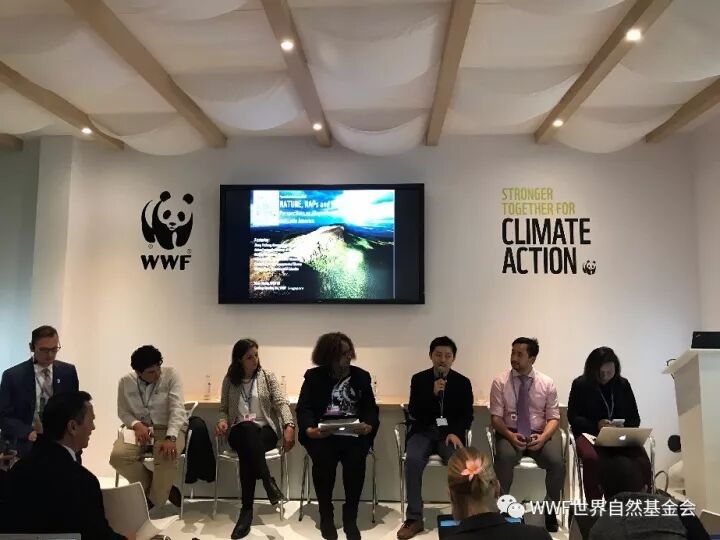 * C6 a& W8 z4 m* u- e* \6 P 当地时间11月13日,WWF在COP23上的系列边会中,就专门举办了一个关于“气候变化适应”的边会。中国、斐济、莫桑比克、哥伦比亚、墨西哥和马达加斯加六国政府代表坐在一起,讨论了气候变化的国家适应和国家贡献等问题。 : {1 p5 C. M7 H