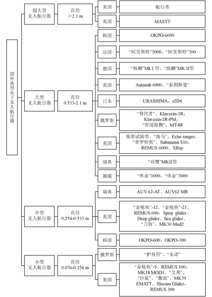 & o' h0 R" ?/ X0 Z3 ~ 军用水下无人航行器全球已列装和在研约50型,按照美海军划分标准统计,可分为超大型2型、大型22型、中型20型、小型11型。其中,中小型主要用于情报监视侦察、反水雷、诱饵欺骗、海洋调查等,大型兼具运载、反潜反舰、电子战等能力,超大型将进一步具备直接打击与对抗等作战能力。