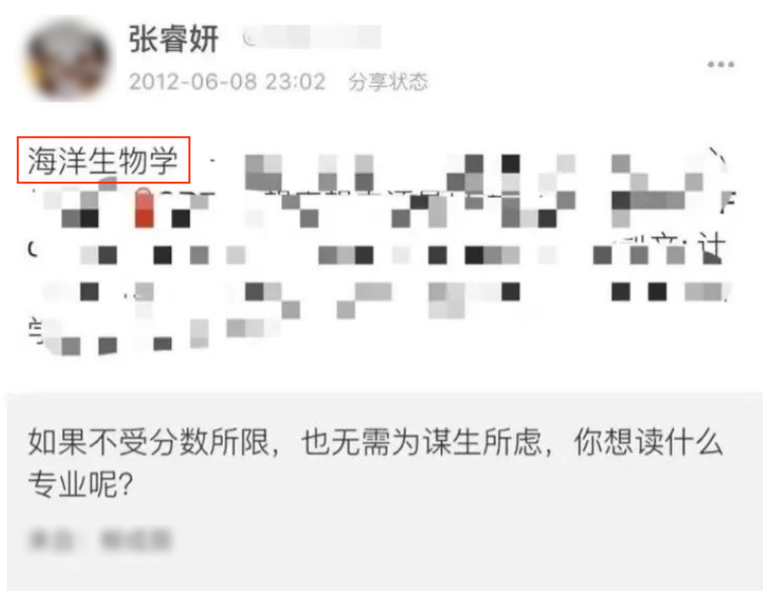 $ }; j* D8 v% W# e2 q3 z/ L “如果不受分数所限,也无需为谋生所虑,你想读什么专业呢?”2012年,当时正读高中的张睿妍回答:“海洋生物学。” 7 C {4 S, @" o( M" _