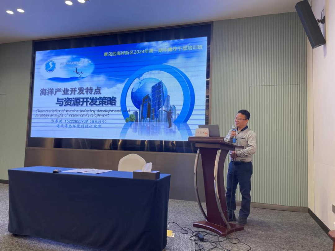 日前,青岛西海岸新区2024年第一期中青年干部培训班顺利举行,40余名来自青岛西海岸新区各职能部门代表进行为期1周的海洋经济贯通式研修学习。我院副研究员方春洪应邀以“海洋产业开发特点与资源开发策略分析”为题,进行3小时授课,基于“只有海洋具有开发不尽的资源、能源和空间,海洋才是唯一值的倾注全力开发的对象”的战略认识,解读了我国海洋产业空间开发特点,梳理了海洋产业用海管理特点,总结了海洋资源开发趋势与策略,并在授课后与学员进行了集中答疑交流。# d$ R, P1 g- j$ R( t- s