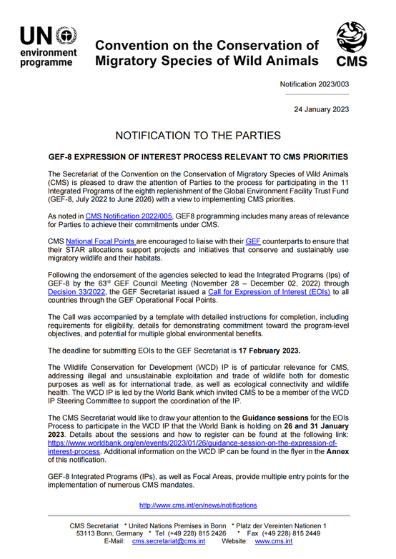 % c" e% n6 s3 |, m8 z/ n( H 《保护野生动物迁徙物种公约》秘书处高兴地提请缔约方注意参与全球环境基金信托基金第八次增资(GEF-8, 2022年7月至2026年6月)11个综合项目的进程,以落实《保护野生动物迁徙物种公约》的优先事项。