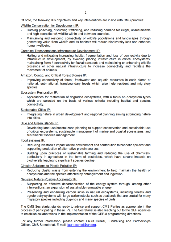 1 h4 [9 a+ u ~6 K, e 正如CMS第2022/005号通知所指出的,全球环境基金信托基金第八次增资项目包括缔约方在CMS下履行承诺的许多相关领域。 " J6 Q% U d4 T; x