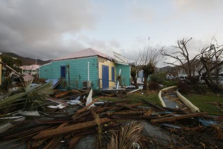 飓风“厄玛”(Irma)对英属维尔京群岛托托拉岛保姆礁上的建筑物造成破坏。(图源:Russell Watkins/DFID ) ; b( E- R! k4 u/ F4 I7 L