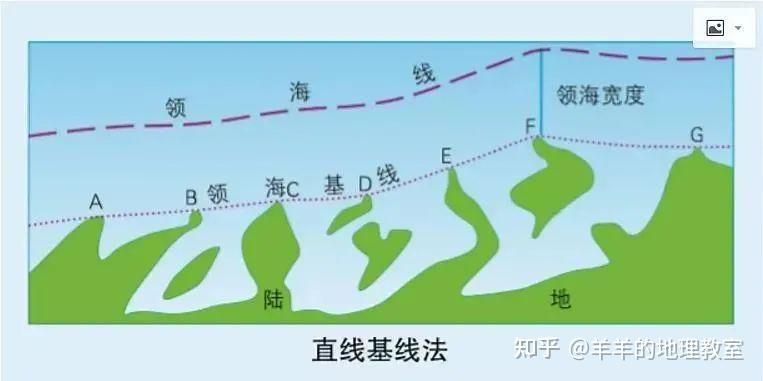 但如果在一些海岸线曲折的地方,或者海岸附近有一系列岛屿时,是使用直线基线的划分方式,即在各海岸或岛屿确定各适当点,以直线连接这些点(领海基点),划定基线。