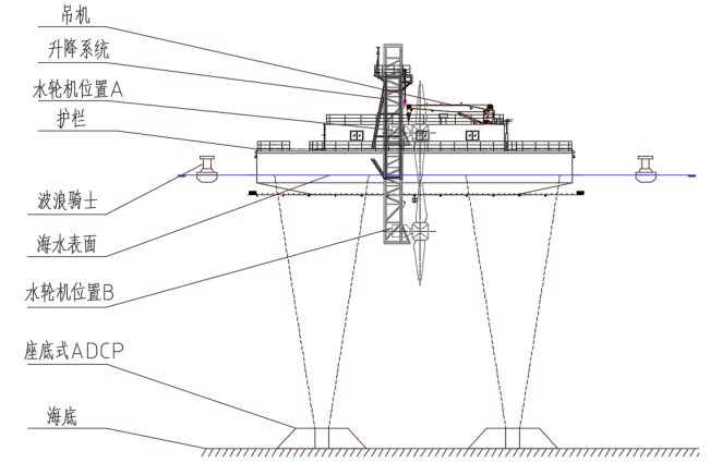 ; U$ b8 \4 ^9 M" t' @ 在图3中可以看出,测试平台安装有吊机以及潮流水轮机升降系统。潮流发电装置拖运至平台附近后,由吊机将测试设备吊装至水轮机位置A,进一步完成测试设备在平台上的安装固定。然后控制升降系统将测试设备浸没至水轮机位置B,开始海上试验测试。升降系统最大行程(水轮机位置A到水轮机位置B)为11m。其中,水轮机位置B距离海水表面5.8m。 + q1 |0 ?: g3 s3 X/ @# x