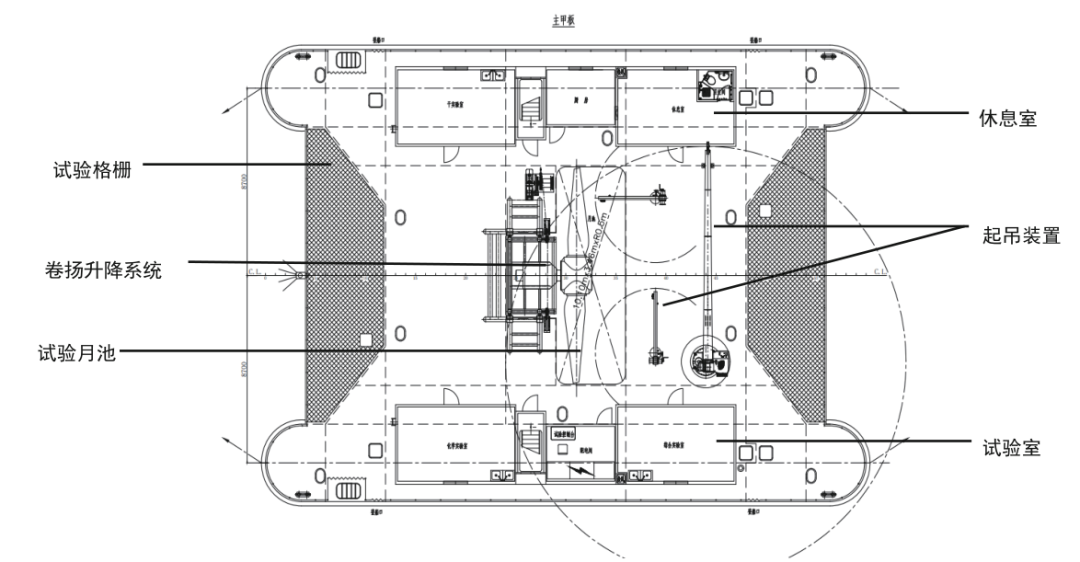 ①锚泊式海上试验平台为钢制漂浮式综合试验平台,采用双浮体船型,具有较好的抗风浪性能。在平台功能方面,充分考虑了各种类型的海洋仪器设备海上试验的需求。