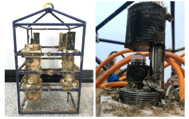 % _- W* p" s7 q( `2 [- O CTD性能海上试验方法参考《海洋仪器研制质量管理规范》《海洋仪器设备海上试验管理规范》《海洋仪器海上试验规范》(HYT141—2001)《“规范化海上试验”质量控制通用规范》等。测试方法为:首先,搭建比测平台。根据被测海洋仪器设备类型,选择相应国际先进的产品作为比测目标。针对抗污染CTD,本文选取海鸟SEB37CTD;其次,将被测抗污CTD与海鸟SEB37CTD安装放入同一比测架内,以相同的数据采样方式进行工作,比测架以及两种CTD安装如图5所示;然后,通过锚链一端连接至锚泊式海上试验平台,一端连接比测架,实现比测架与测试海洋仪器设备的投放以及长时间测试;最后进行设备回收,并进行第三方检测认证。在本文抗污染CTD测试中,设备回收后的状态如图6所示,交由第三方检测机构复检结果显示:长时间海上测试后参试设备电导率最大漂移为0.0235mS/cm。 6 L. g! K1 n5 J+ h2 O; r