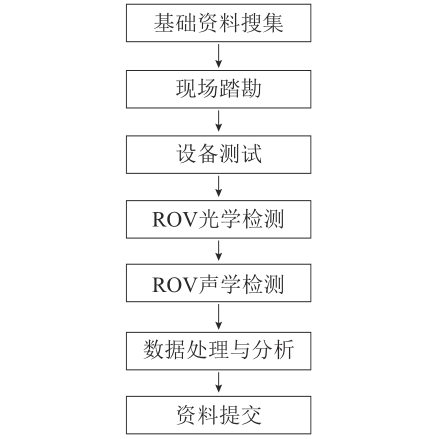 , f- _ ?8 g9 ^& N$ o! \ 基于ROV平台的检测方法和流程见图2:首先搜集检测区域的基础资料,如拦污栅的设计、施工、交工及历次检测成果,明确检测工作的重点和要求。根据前期搜集的相关信息,对现场进行踏勘,了解作业区域条件,如是否具备交流电供电、ROV设备的入水及回收位置、是否具有作业船舶等。准备工作完成后ROV可进场作业。ROV入水前先进行自检,入水后测试其各个推进器及传感器是否工作正常,待系统全部就绪后,由操作手控制其前往指定区域进行探测。检测时按照从上到下,从光学检测到三维图像声呐检测的顺序进行。进行三维图像声呐检测工作时,将ROV由人工操作模式切换至坐底模式,使其在观测位置保证相对静止状态,先使用声速计读取该位置的声速用于改正,再由三维图像声呐对观测部位进行数据采集工作。如果存在多个观测点位,则重复进行观测。观测完成后对数据进行处理和分析,编制技术报告,同时针对检测工作中发现的问题提交典型图像和点云资料,用于后续修复工作。
