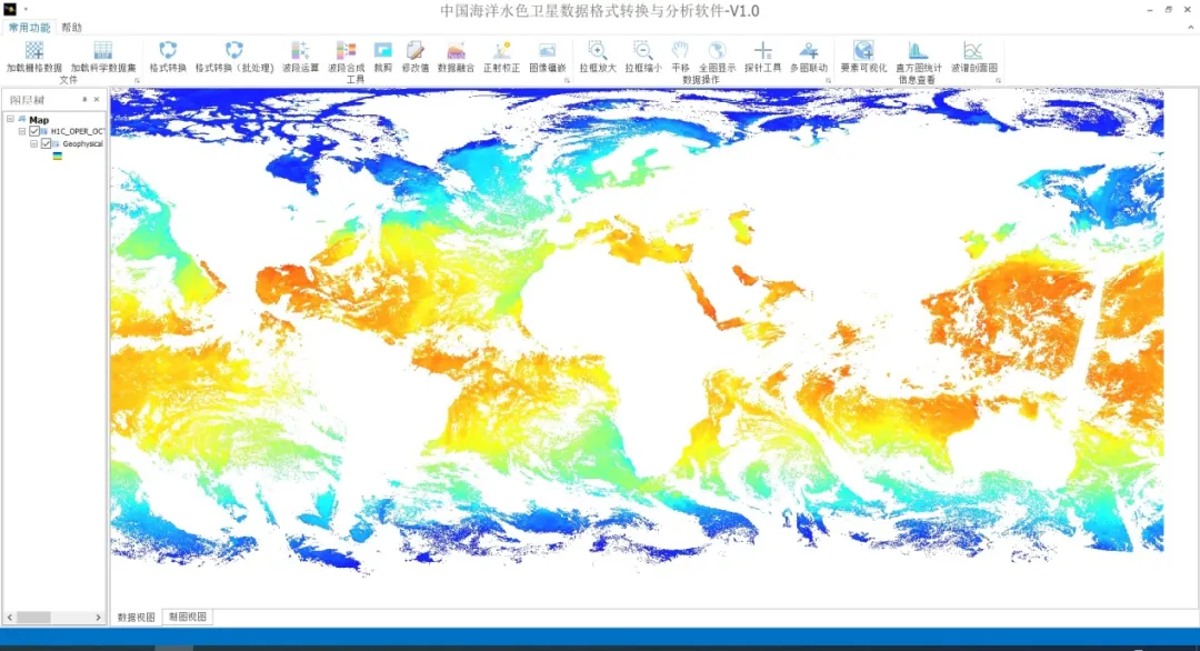 % R- e H6 `$ S# t 海洋一号C卫星(HY-1C)和海洋一号D卫星(HY-1D)自发射以来,其数据产品在海洋生态监测应用等多领域发挥了重要作用。为不断提高服务质量,更好地满足我国海洋水色卫星数据用户需求,国家卫星海洋应用中心研制了“中国海洋水色卫星数据格式转换与分析软件V1.0”,以实现对中国海洋水色卫星数据的格式转换和分析。正值HY-1C卫星在轨运行五周年之际,现发布其试用版。