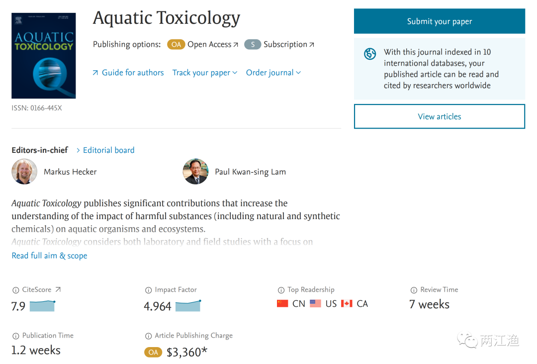 AQUATIC TOXICOLOGY是一本中科院SCI期刊分区表(升级版)中的一区期刊,主要发表有毒物质对水生生物和生态系统的影响方面有重要贡献的文章,一般不发表关注与水产养殖实践相关的水产养殖生物健康的文章,也不发表表征受污染鱼类或其他水产食品对人类或牲畜的潜在风险的研究。该期刊除了传统的出版方式外也支持开放获取,但是费用需要USD 3360! * [; t0 }: [; n2 |! o