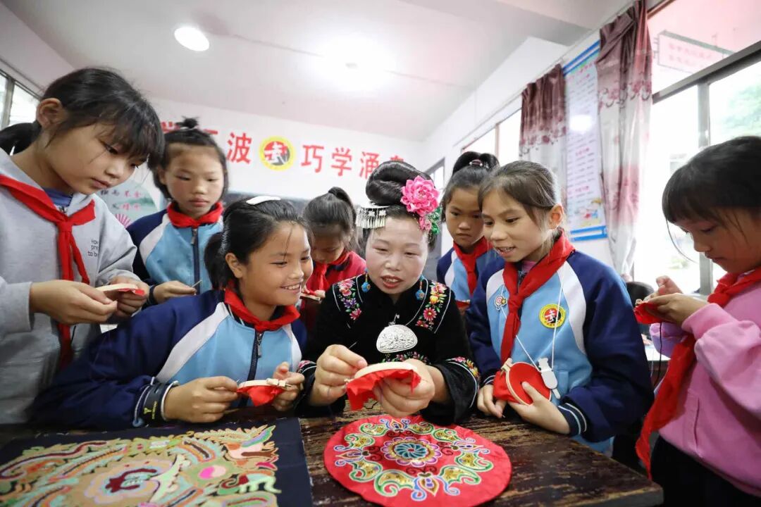( t' m4 A, V3 d0 S0 F& n; F1 U& @/ x 6月10日,非遗传承人在贵州省黔东南苗族侗族自治州丹寨县金泉街道金山小学向学生展示苗族刺绣技艺。黄晓海 摄 3 O) h8 E, ?. t; D) \. w1 Y