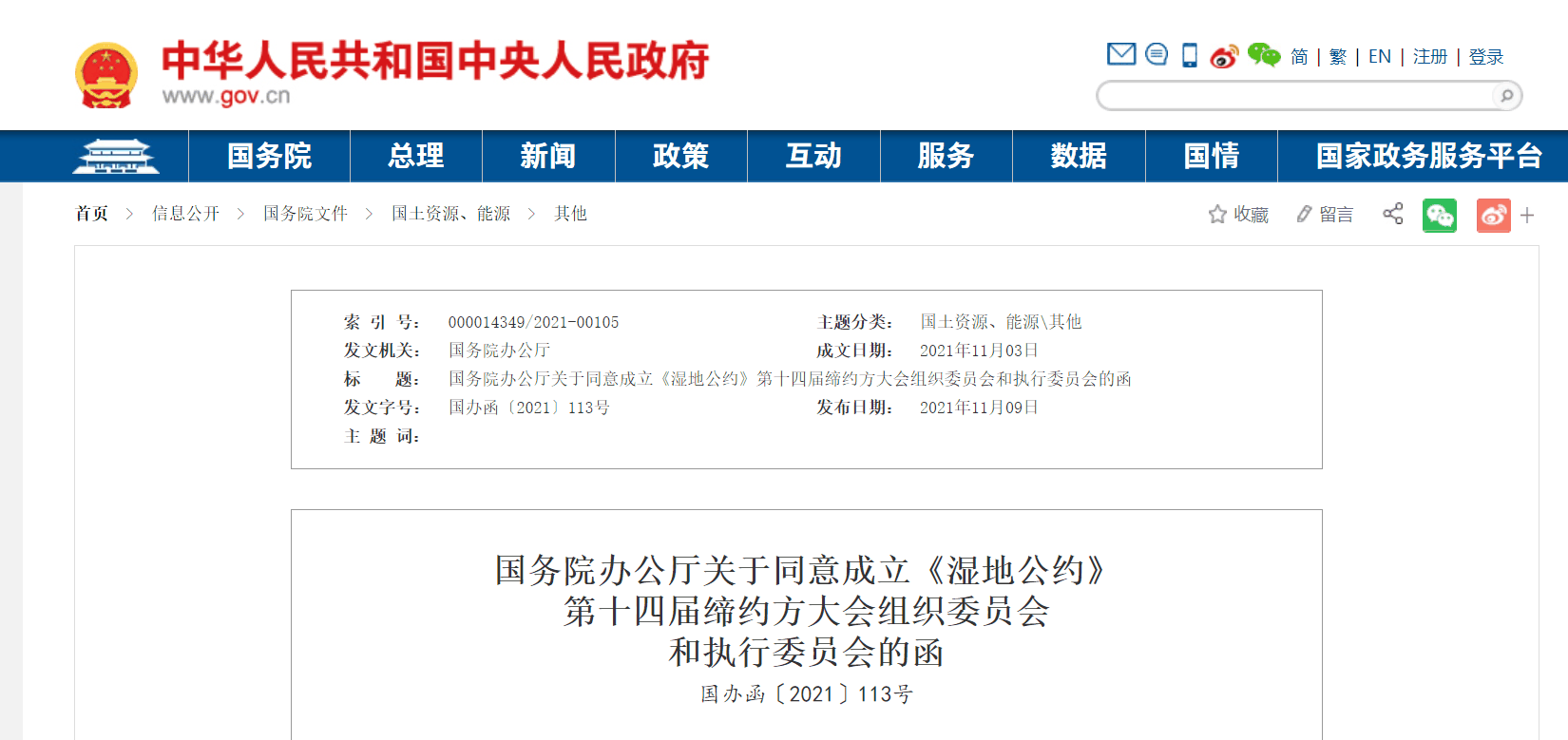 自然资源部关于成立《湿地公约》第十四届缔约方大会组织委员会和执行委员会的请示(自然资发〔2021〕138号)收悉。经国务院批准,现函复如下: