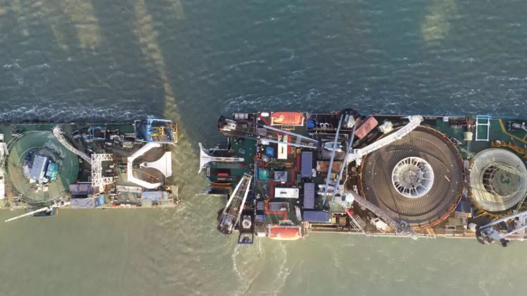 # Q. g7 n# l0 K d8 u: ? 海缆敷设施工船满载海底电缆,抵达距离南岭终端站5.5公里左右的指定敷设海域。海缆敷设施工船与另一艘辅助施工船对接,开始倒缆,将部分电缆转移到辅助施工船上。 : g8 `1 K- k' n, R; V