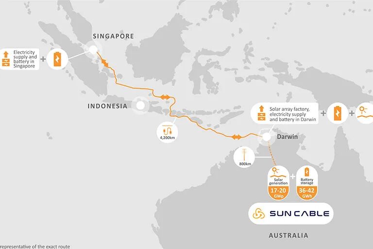 6 x9 o- @% w* u 新加坡与太阳能发电场将通过5,000公里长的高压直流(HVDC)传输系统连接起来。一条800公里长的高架线将沿着铁路走廊延伸到靠近澳大利亚北领地首府达尔文市(Darwin)的利文斯通(Livingstone),并且将在海岸附近安装大型地面电站电池。