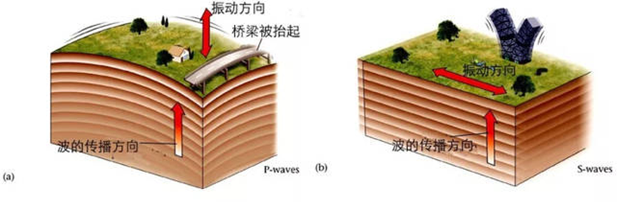 . r C" u8 {0 [' h5 T7 y 地震纵波使地面上下颠簸、横波使地面左右晃动