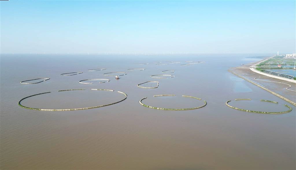 4 \; [6 {# ` X+ w1 K4 k 中交三航局承建的二标段位于上海最东南角——号称“东海阳台”的南汇嘴观海公园外侧,工程内容以生态修复为核心,包括建造18座潮间带牡蛎礁、3座低滩湿地泡、1167米生态管护栈道、1座碳通量塔以及修复2782米堤前消浪坝,治理护花米草,种植芦苇、红树林及投放底栖生物等。