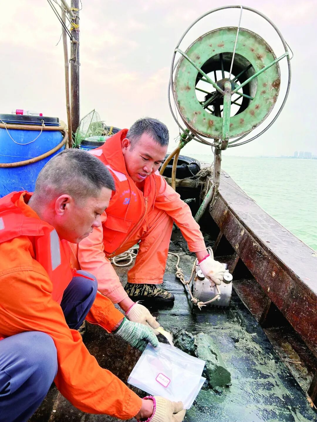 地质队员将采集的海底底质样品进行分装 & H+ z3 p3 T- L! P) z* R