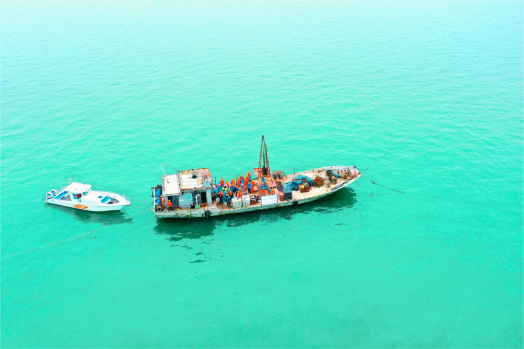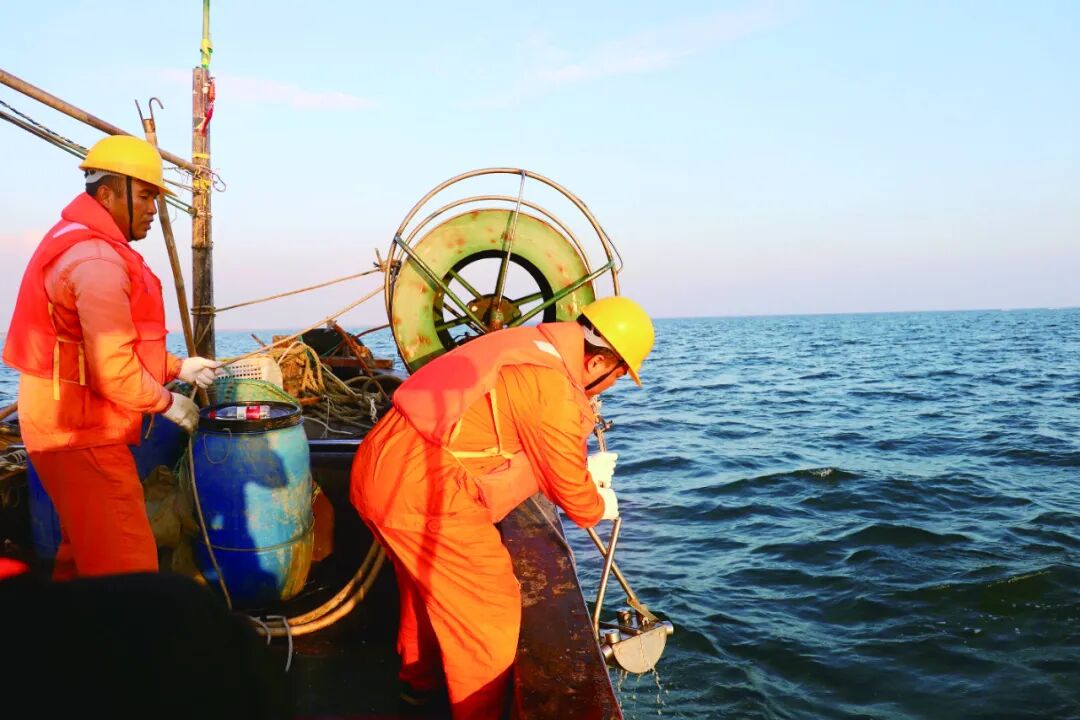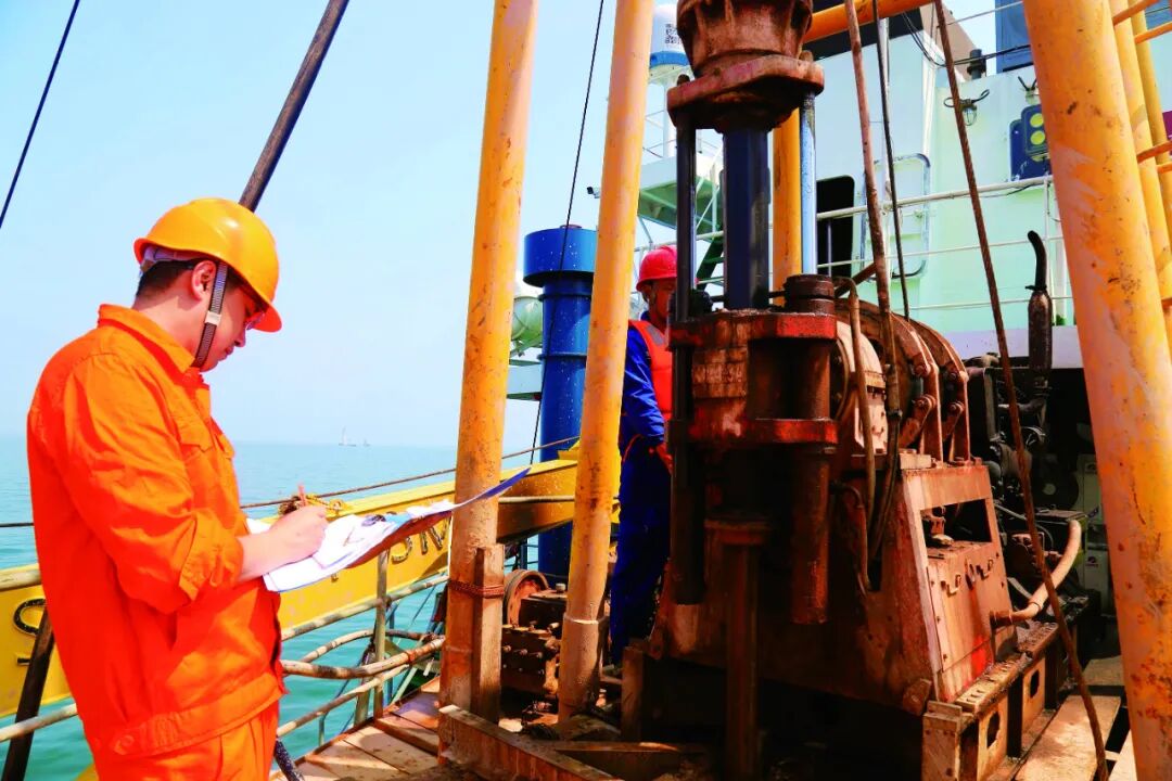 ; ]7 U2 I& F7 { 地质队员在开展海洋地质工作,为海上风电项目提供基础海洋工程地质资料