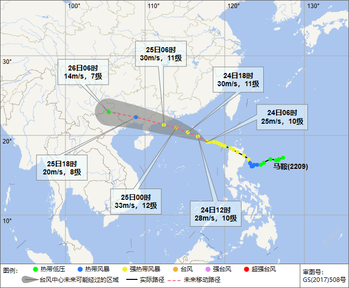 海南省气象局2022年08月24日06时30分发布台风四级预警台风动态今年第9号台风“马鞍”(强热带风暴级),24日06时中心位于北纬19.2度、东经117.8度,也就是在广东省阳江东偏南方向约670公里的南海北部海面上,中心附近最大风力10级(25米/秒),七级风圈半径200~240公里。预计,“马鞍”将以每小时25公里左右的速度向西偏北方向移动,强度逐渐增强,并将于25日早晨到下午在广东深圳至湛江一带沿海登陆(25~33米/秒,10~12级,强热带风暴级或台风级),登陆后强度逐渐减弱。
