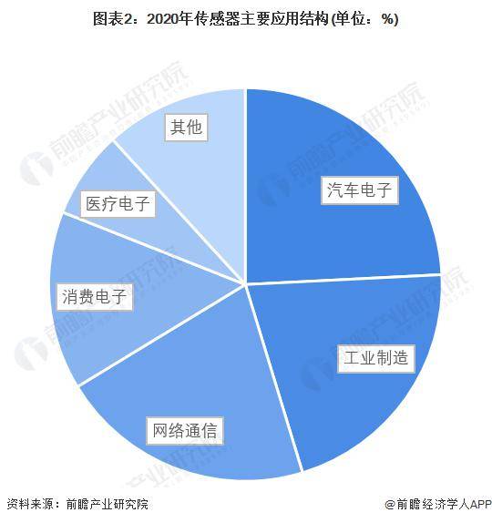 从传感器应用占比看,汽车电子、工业制造和网络通信领域是传感器应用最主要的三大领域,占比均超过20%。除此以外,消费电子、医疗电子等应用占据也均超过7%。 : [! F# U, A# G2 E- K; R, `