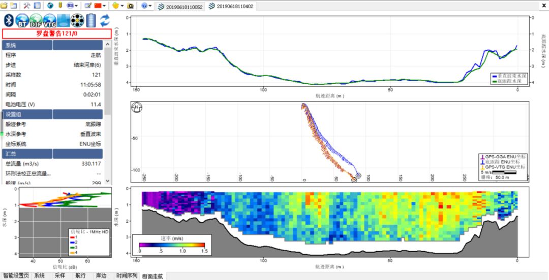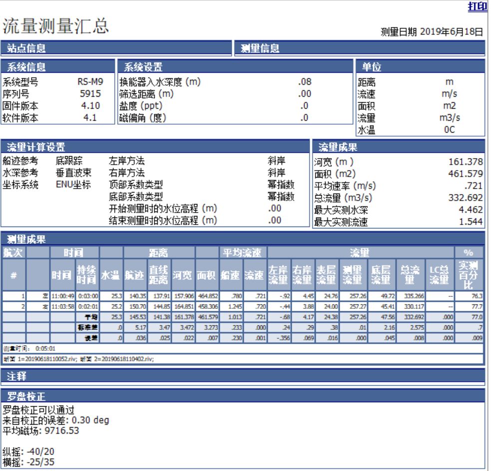走航ADCP(SonTek M9)沱江测流,在上午11点正式开始,测量河宽161m,平均流速0.72m/s,单次流量分别为330m3/s和335m3/s 平均流量332m3/s ,测量误差0.8%,远小于水文规范的5%,充分展示了M9的强大性能及稳定性。   d& E- n' p+ y9 p& t
