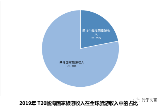 海洋旅游在世界旅游业中占有举足轻重的地位并且呈现强势增长态势。在全世界旅游收入排名前25位的国家和地区中,沿海国家和地区有23个,这些国家和地区的旅游总收入占到全世界的近70%。2019年,T20国家中有18个为临海国家,其旅游收入占全球旅游收入的21.90%