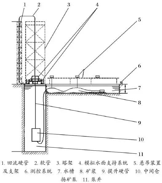 大洋多金属结核中试采矿概念系统 (见图 3) 由集矿子系统、扬矿子系统、测控与动力子系统和水面支持系统组成。2001 年在云南抚仙湖完成了大洋多金属结核采矿中试系统的综合湖试,湖试系统由中试采矿系统的集矿子系统、软管输送子系统、测控及动力子系统和满足系统试验的简易水面支持子系统组成。湖试水深 130 m,湖试成功实现从湖底采集并输送模拟结核到水面船,打通了采矿系统工艺流程。根据前期深海采矿技术基础研究成果和湖试结果,完成了中试采矿系统 1 000 m 海试的总体设计。海试的集矿子系统选用自行式集矿机,扬矿子系统由垂直提升硬管段、中间仓和软管段 3 部分组成,海试定位系统采用超短基线定位技术以及水面支持系统采矿船等。“十一五”以及后期的深海采矿技术研究规划中,在中国大洋协会的专项资助下,长沙矿冶研究院深海矿产资源开发利用技术国家重点实验室计划进行采矿系统水下综合模拟试验的研究,系统由模拟水面支持系统、提升系统、塔架、背压调节装置、软管悬吊装置、移动支架、中间仓、水池、水力吸砂头,以及测控和动力输配系统组成 (见图 4)。提升硬管和中间仓则悬吊在由升沉补偿装置和波动模拟平台构成的模拟水面支持系统上,该系统能通过模拟波动平台模拟海面波动。通过实验室模拟试验和水下综合试验,考核动态下扬矿系统和设备运行的可控性与协调性,以及扬矿动力与测控系统的可靠性,为海上试验提供基础数据。