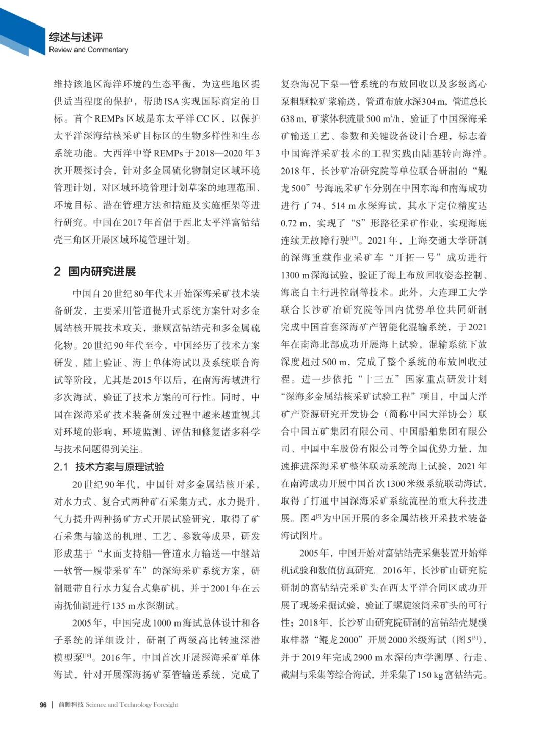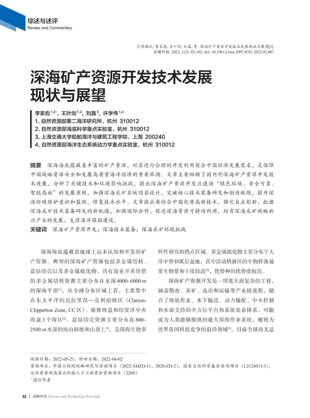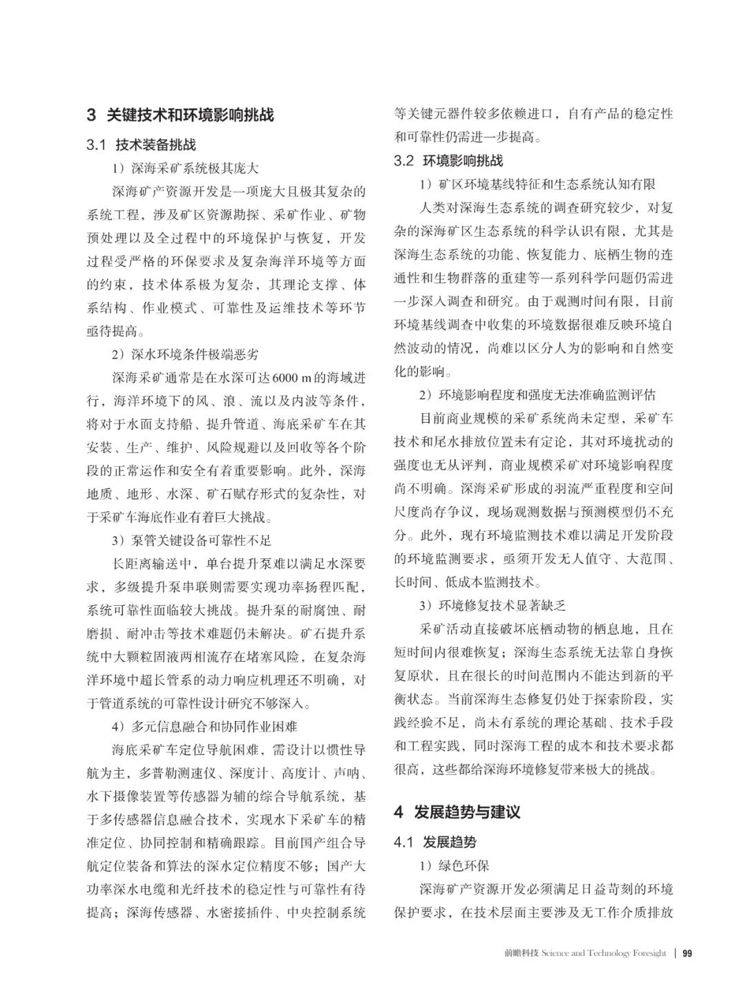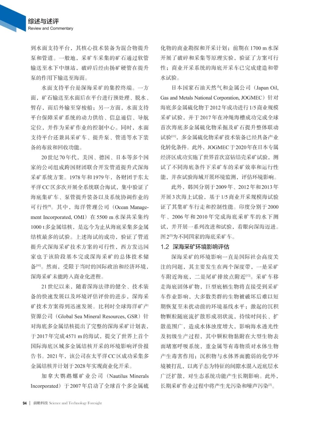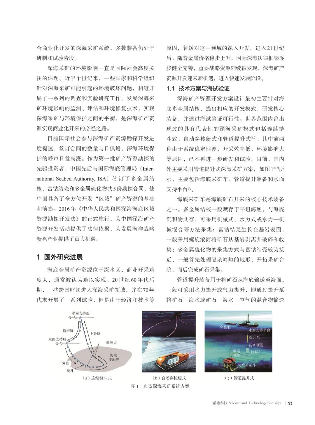 * |7 ~) {5 c, Y* @3 c* I 深海海底蕴藏着地球上远未认知和开发的矿产资源。目前全球尚无适合商业化开发的深海采矿系统,多数装备仍处于研制和试验阶段。本文回顾了国内外深海矿产资源开发技术进展,分析了关键技术和环境影响挑战,提出深海矿产资源开发应遵循“绿色环保、安全可靠、智能高效”的发展原则,加强深海采矿系统顶层设计,突破核心技术装备研发和制造瓶颈,提升深海环境保护意识和监测、修复技术水平。