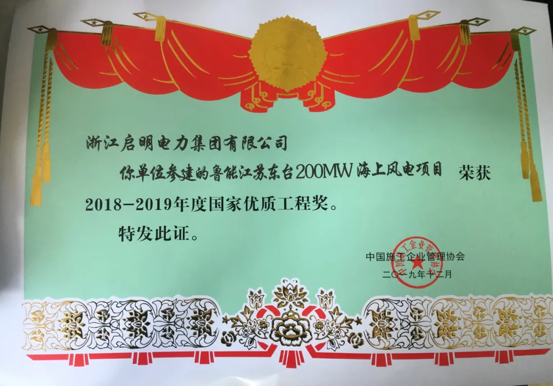 海缆施工项目部抓住国家能源变革海上风电迅猛发展的机遇,利用优势实现重点核心装备和关键技术的突破,积极走出舟山参与海上风电建设,江苏东台200兆瓦海上风电项目荣获“2018-2019年度国家优质工程奖”奖状,该工程施工区域地质条件复杂、施工难度大,浅滩区域长度创下当时国内登陆之最,海缆施工项目部打破常规施工工艺,创新采用了牵引+脚手架的登陆新方法、埋深+预留敷设余量的新工艺,提前一个多月完成全部海缆敷设,此项工程对推动近海风电发展具有重要意义。 ) h; U* L: K& l# D7 y& Y2 F$ `