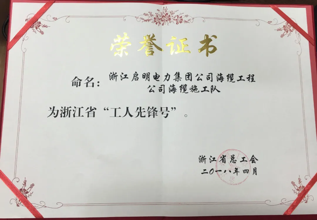 : }, d! w" Y$ R5 |2 u0 X 近年来海缆施工项目部先后完成世界首个五端柔性直流示范工程、浙江省第一个海上风电国电舟山普陀6号海上风电场2区工程海缆工程、220千伏鱼山输电线路工程、世界首个500千伏交联聚乙烯海底电缆工程等工程。班组先后获得“全国青年安全生产示范岗”、“浙江省工人先锋号”、“浙江省青年文明号”等荣誉称号,参加的两个工程获得“2018-2019年度国家优质工程奖”奖状、“2020—2021年度第一批国家优质工程金奖”。