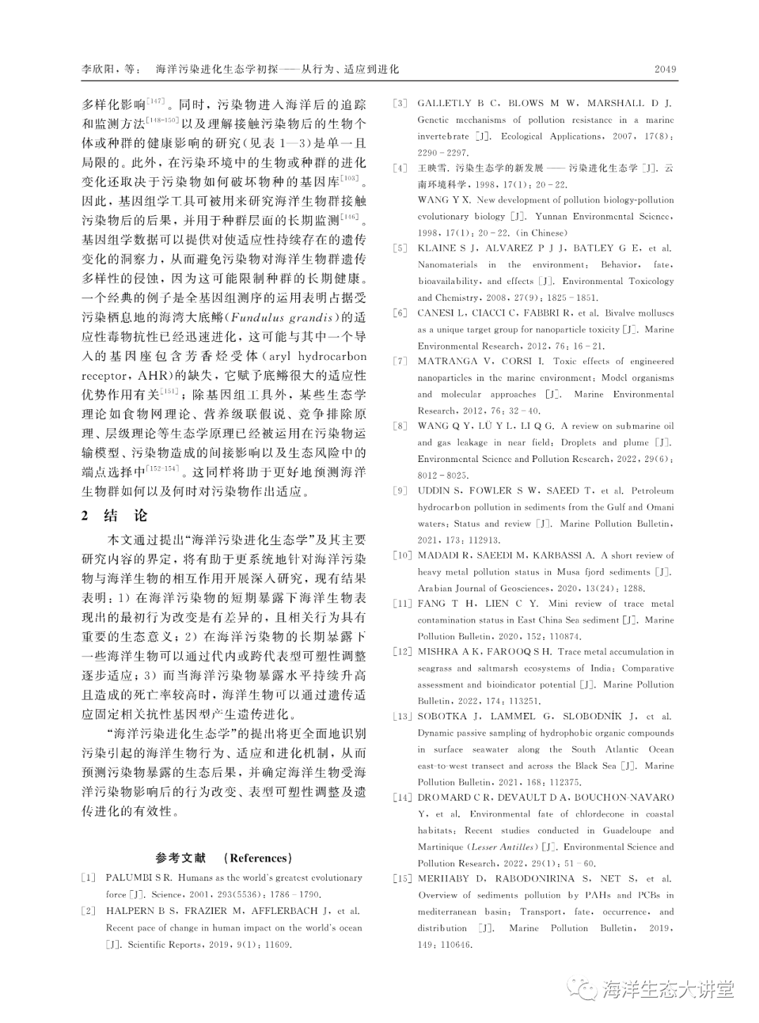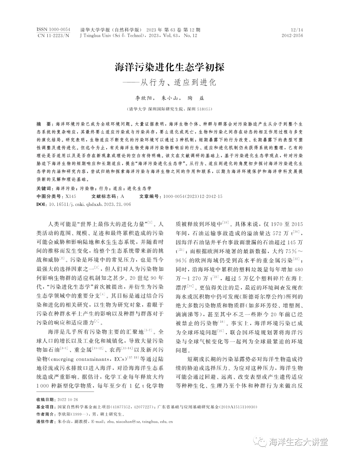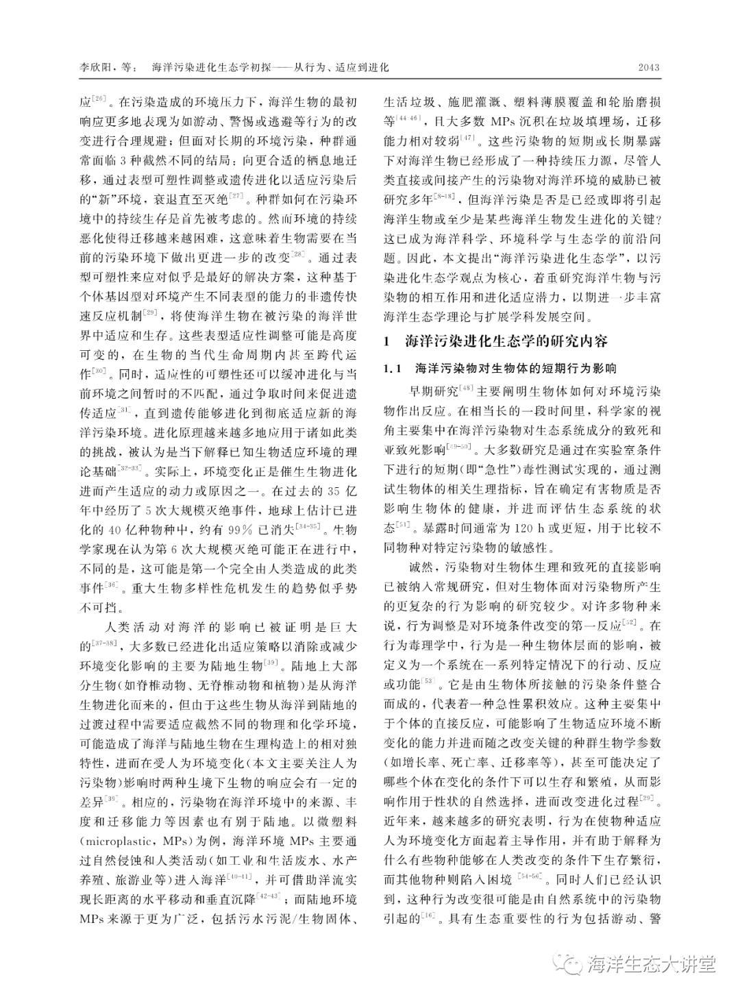 海洋污染进化生态学初探——从行为、适应到进化李欣阳, 朱小山, 陶益(清华大学 深圳国际研究生院, 深圳 518055)摘要:海洋环境污染已成为全球环境问题。大量证据表明,海洋生物个体、种群与群落会对污染胁迫产生从分子到整个生态系统的复杂响应,其最终要么适应污染或与污染共存,要么退化或死亡,生物和污染之间存在动态的相互作用过程与多变的演化结局。研究表明,生物适应不断变化的污染环境可以通过3种机制:短期暴露下的行为改变、长期暴露下的表型可塑性调整及遗传进化。但迄今为止,有关海洋生物受海洋污染物影响后的行为、适应和进化机制仍未获得系统的整理,已有的理论是否适用以及是否存在新现象或理论的空白有待明确。该文在文献调研的基础上,基于污染进化生态学观点,针对污染胁迫下海洋生物的短期响应和长期适应,提出“海洋污染进化生态学”。从行为、适应到进化的角度初步探讨海洋污染进化生态学的内涵和研究内容,尝试归纳和探索海洋污染与海洋生物之间的作用和联系,以期为海洋环境保护和海洋学科发展提供新的见解和理论基础。关键词 : 海洋污染, 污染物, 行为, 适应, 进化生态学
