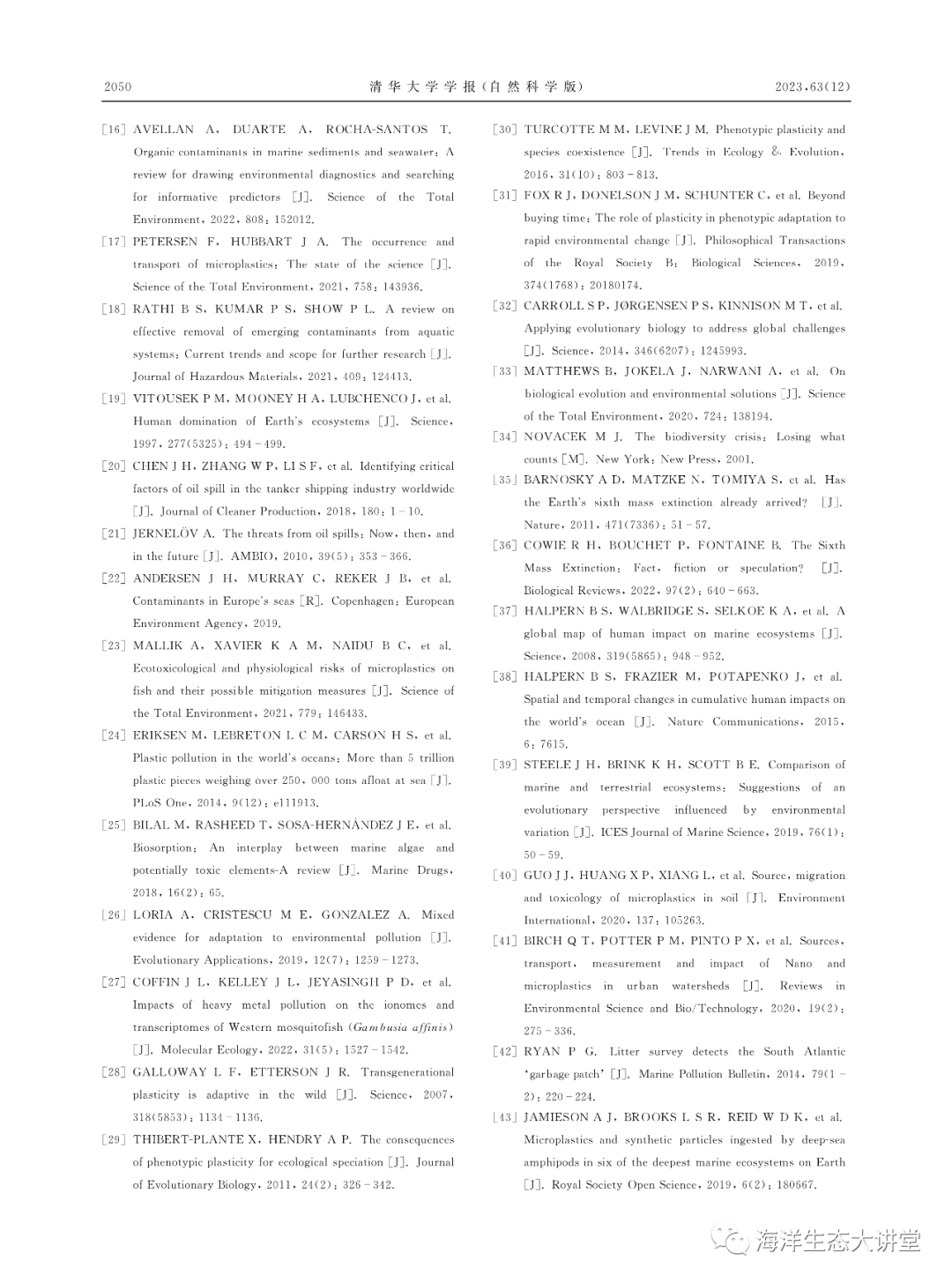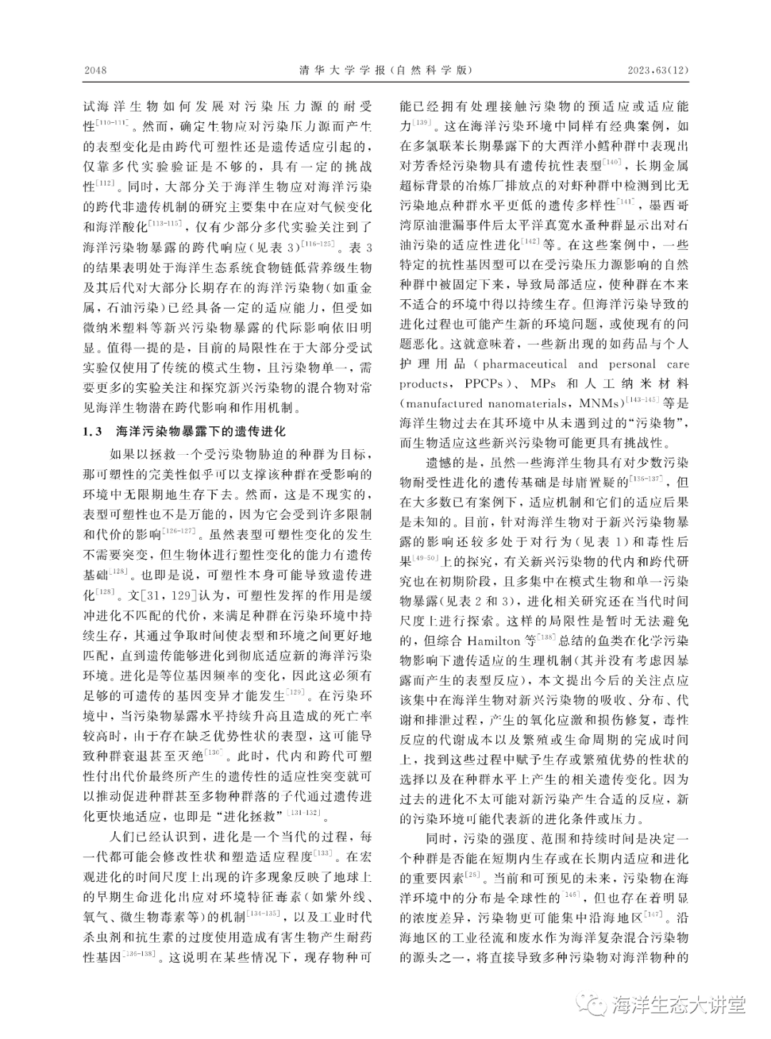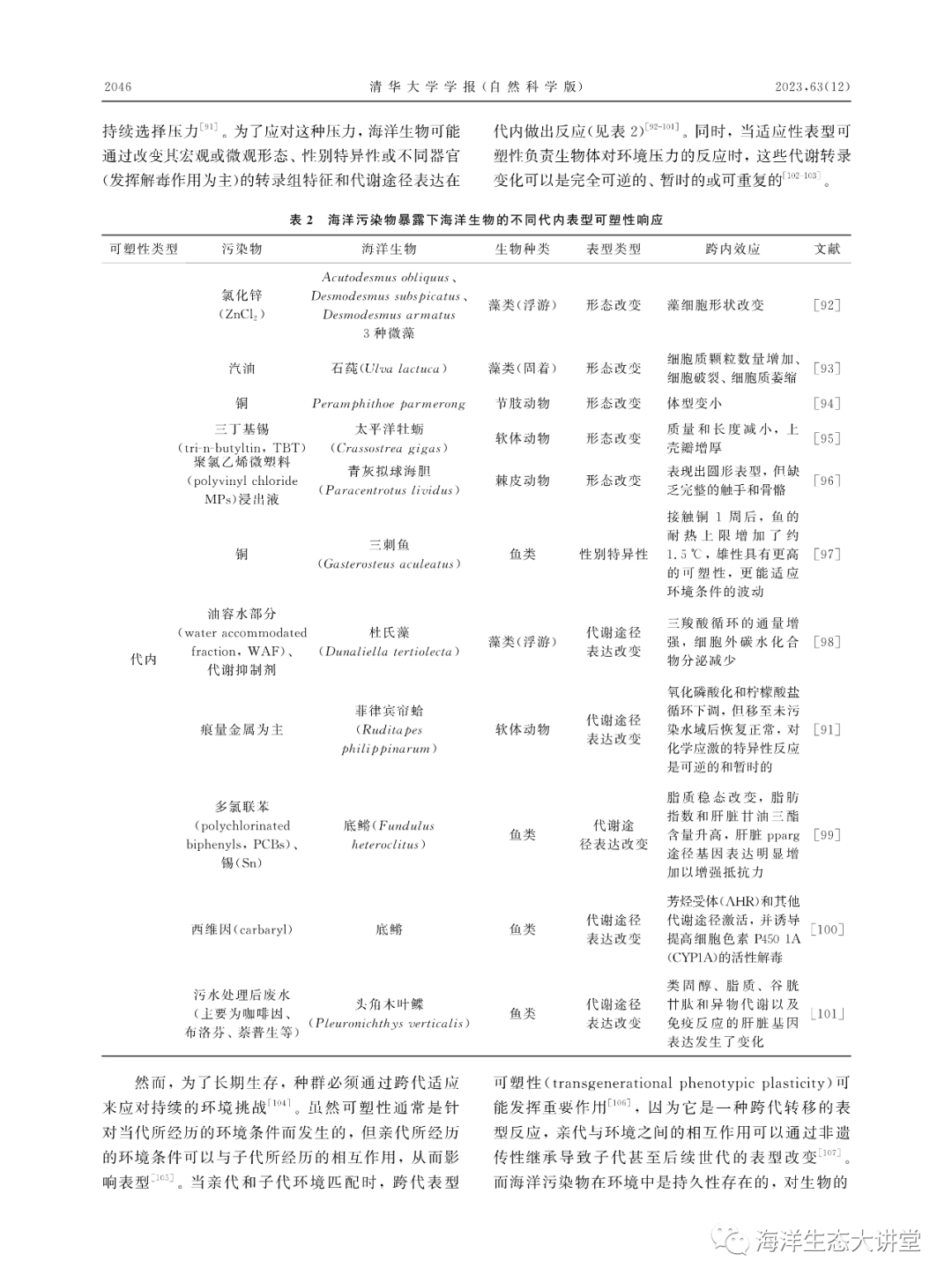 海洋污染进化生态学初探——从行为、适应到进化李欣阳, 朱小山, 陶益(清华大学 深圳国际研究生院, 深圳 518055)摘要:海洋环境污染已成为全球环境问题。大量证据表明,海洋生物个体、种群与群落会对污染胁迫产生从分子到整个生态系统的复杂响应,其最终要么适应污染或与污染共存,要么退化或死亡,生物和污染之间存在动态的相互作用过程与多变的演化结局。研究表明,生物适应不断变化的污染环境可以通过3种机制:短期暴露下的行为改变、长期暴露下的表型可塑性调整及遗传进化。但迄今为止,有关海洋生物受海洋污染物影响后的行为、适应和进化机制仍未获得系统的整理,已有的理论是否适用以及是否存在新现象或理论的空白有待明确。该文在文献调研的基础上,基于污染进化生态学观点,针对污染胁迫下海洋生物的短期响应和长期适应,提出“海洋污染进化生态学”。从行为、适应到进化的角度初步探讨海洋污染进化生态学的内涵和研究内容,尝试归纳和探索海洋污染与海洋生物之间的作用和联系,以期为海洋环境保护和海洋学科发展提供新的见解和理论基础。关键词 : 海洋污染, 污染物, 行为, 适应, 进化生态学