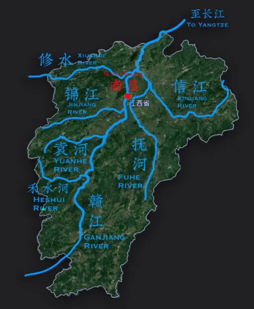 “五河”为赣 、抚、信、饶、修五大河流:它们流入鄱阳湖,经湖口注入长江,形成一个完整的以鄱阳湖为中心的向心水系。其中赣江流域面积最大,约占全省总面积的一半,江西简称“赣”,也由此得名。 湖泊众多